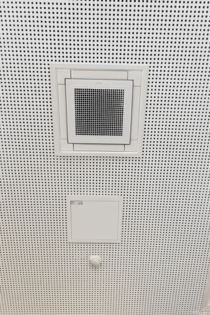 Zusätzlich war die Herstellung zweier abgehängter Akustikdecken erforderlich, in welche die Kassettengeräte optimal integriert wurden.